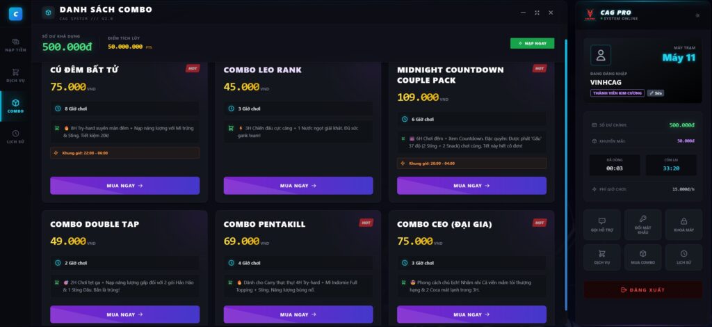 Phần mềm quản lý quán net Miễn Phí CAG Billing là nền tảng tính giờ, quản trị dịch vụ và vận hành cyber games được thiết kế cho mô hình NetGen: hiện đại, tốc độ cao, tối ưu trải nghiệm game thủ và nâng cao doanh thu phòng máy. Với cơ chế trừ tiền trực tiếp vào tài…